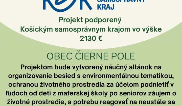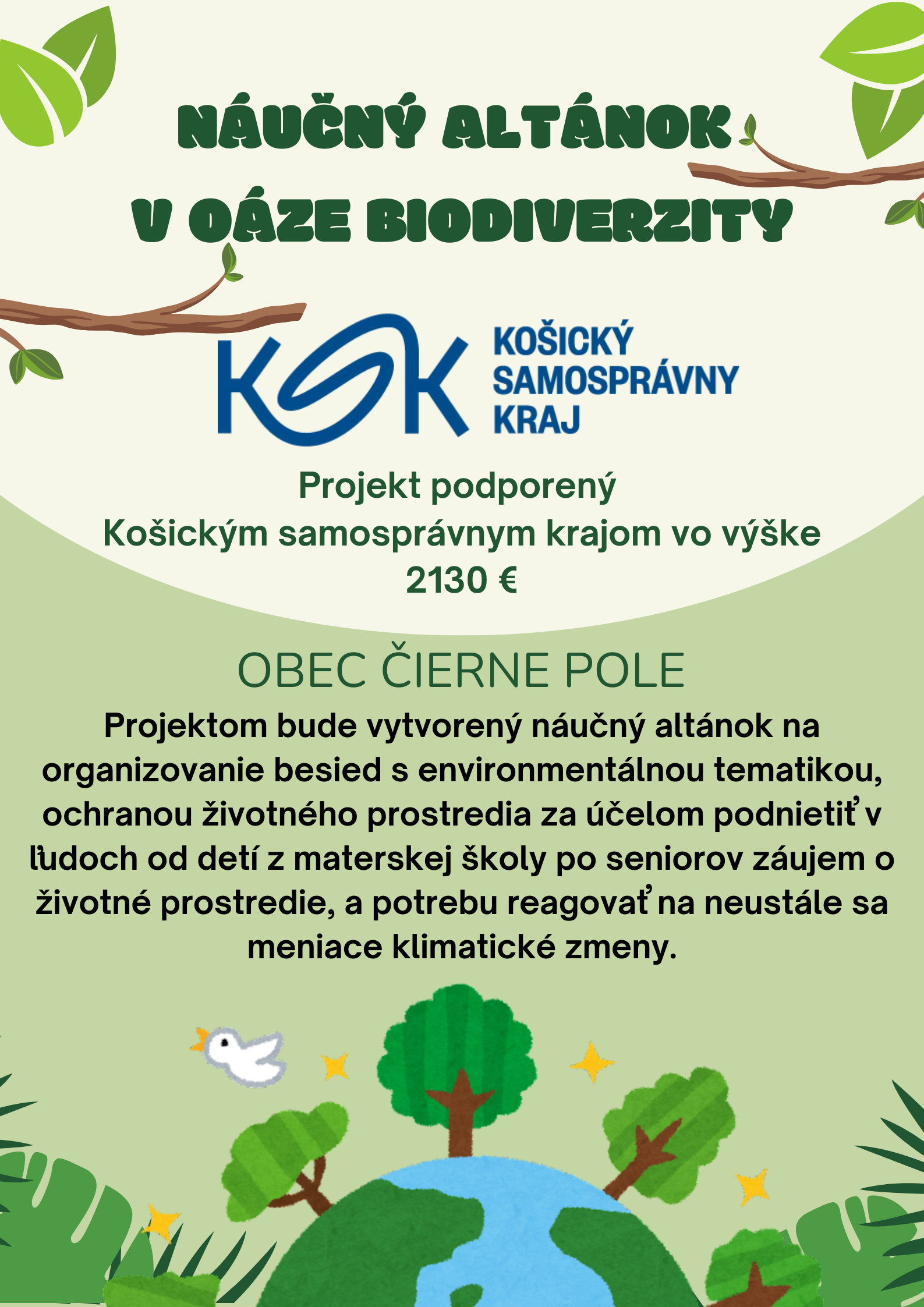 Projekt podporený Košickým samosprávnym krajom vo výške 2130€. Projektom bude podporené vybudovanie náučného altánku v Oáze Biodiverzity v našej obci.