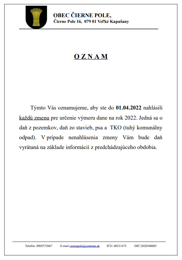 OZNAM - nahlásenie zmeny pre výmer dane 2022