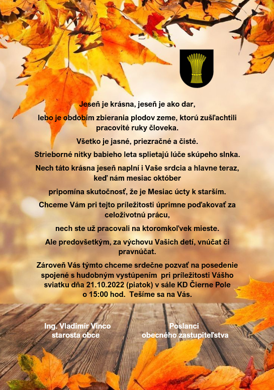 starosta obce spolu s poslancami obecného zastupiteľstva Vás srdečne pozývajú na posedenie spojené s hudobným vystúpením pri príležitosti mesiaca úcty k starším dňa 21.10.2022 (piatok) o 15:00 hod. v sále kultúrneho domu. Pripravili sme si pre Vás občerstvenie a darček.