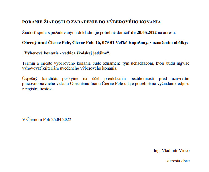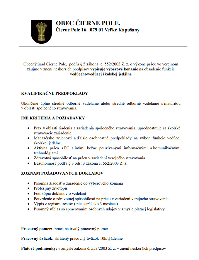 Výberové konanie na obsadenie miesta Vedúceho/vedúcej školskej jedálne Materskej školy Čierne Pole