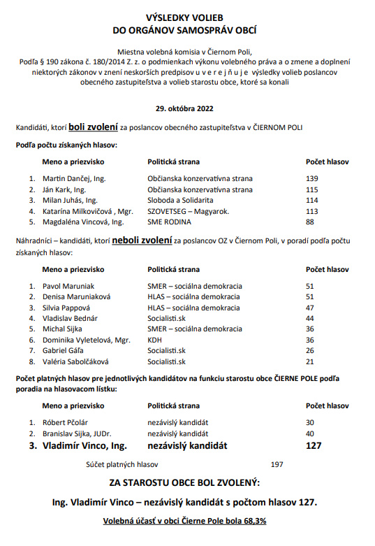 Výsledky volieb do OSO v Čiernom Poli 2022