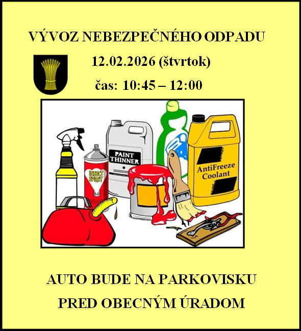 oznamujeme Vám, že na základe harmonogramu bude dňa 6. augusta 2025 (streda) v našej obci uskutočnený vývoz nebezpečného odpadu v čase od 10:45 až 12:00. Zber sa nevykonáva po obci ale iba na jednom mieste. Auto bude zaparkované pred obecným úradom.